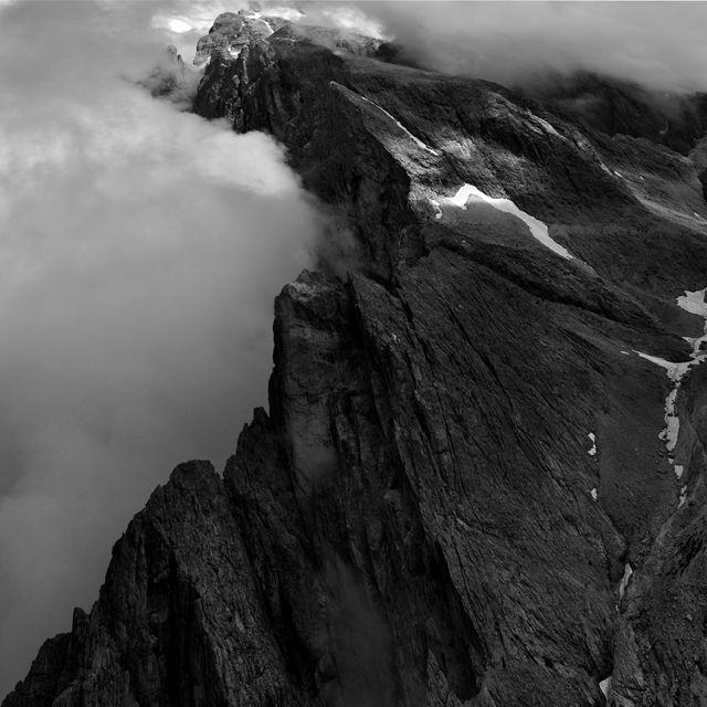 Siamo ai piedi delle Pale di San Martino, nell’Alta valle del Primiero, Trento. Tra picchi e nuvole le immagini intendono sottolineare la percezione forte e materica della montagna. Le luci rivelano la materia grezza della roccia ed alludono al dialogo palpabile tra cielo e alte cime, evocando anche l’esperienza di chi sfida e conquista le alte quote.
