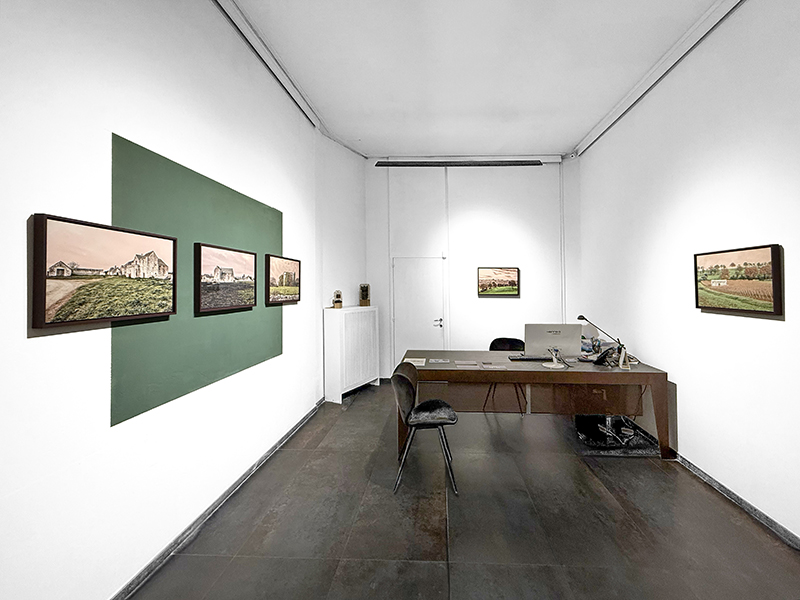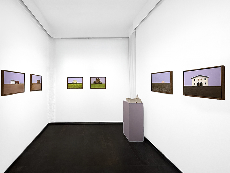 The photographic language could be defined as “illustrative,” so much so that Vitali’s camera lens seems to slowly traverse the countryside or urban centers, capturing that enchanted atmosphere that directly connects to a magical, ancient, in some cases archaic world, giving life to a timeless imagery. The shooting point determines the framing, focusing attention now on the ground, the pavement, now on the architecture, or more rarely, on the vegetation. Always under a large, dominant sky, often represented by large, uniform fields, created in post-production.