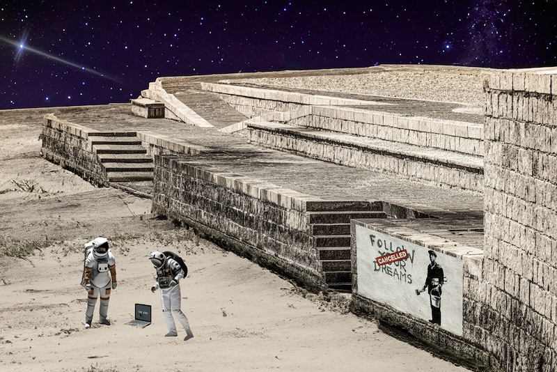 A landing in a remote place. In a game of overlapping layers of quotes, the universal man observes the earth and the problems that afflict humanity from another time: war, violence, deforestation, pollution, migrations… Even in the face of an impossible future, a yearning for hope and justice shakes the scene. In the end, we fall back into the drama of a society destroyed by a dystopian cultural and social involution. In a circular journey, we return to an anguishing desolation in which it seems that no real progress is actually feasible.